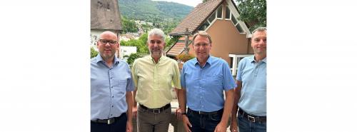 Stabübergabe beiden Stadtwerken Wehr: Markus Linder (links außen) übernimmt die Geschäftsführung von Erich Götz (zweiter von rechts) und Jürgen Scheib (rechts außen). Aufsichtsratschef und Bürgermeister Michael Thater (Freie Wähler, zweiter von links) gratuliert. Quelle: Stadtwerke Wehr |