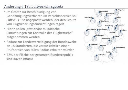 Der Bundesverband Windenergie (BWE) befürchtet durch eine Änderung im Luftverkehrsgesetz massive Einschränkungen für den Ausbau der Windenergie an Land. Im Rahmen des Genehmigungsbeschleunigungsgesetzes wird auch § 18a des Luftverkehrsgesetzes (LuftVG) geändert. Sinn und Zweck von § 18a LuftVG ist der Schutz der Funktionsfähigkeit von Flugsicherungseinrichtungen vor Störungen von Bauwerken. Bei Flugsicherungseinrichtungen handelt es sich um Anlagen am Boden, die für die Navigation eines Luftfahrzeugs erforderlich sind und die Störungen durch Bauwerke ausgesetzt sein können.