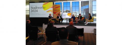 Das Podium auf der Stadtwerketagung 2024. Quelle: E&M / Susanne Harmsen