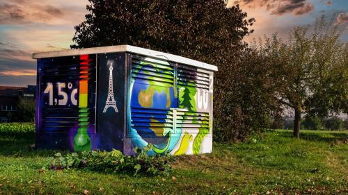 Das Klimaschutzziel als Kunst am Trafokasten.