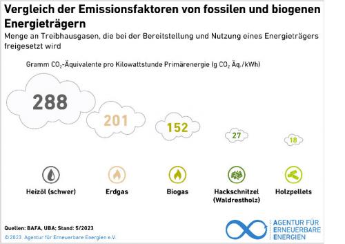 Hintergrund Klimabilanz der BiomasseGegenüber fossilem Erdgas verursachen biogene Energieträger bis zu 90 Prozent weniger Treibhausgase aus, so die AEE. Der Vorteil der Bioenergie bestehe darin, dass bei der Verbrennung nur so viel CO2 freigesetzt wird, wie die Pflanze während ihres Wachstums aus der Atmosphäre aufgenommen wurde. Bei fossilen Brennstoffen ist dies CO2 von vor Jahrmillionen. Zwar wird bei der Holzverfeuerung auch längerfristig gebundener Kohlenstoff freigesetzt, jedoch herrscht in Deutschland das Prinzip der nachhaltigen Waldwirtschaft, wonach nicht mehr Holz entnommen wird, als insgesamt nachwächst.