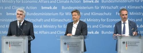 Nach dem 2. PV-Gipfel: v.li. Armin Willigmann (Energieminister Sachsen-Anhalt), Bundeswirtschaftsminister Robert Habeck und Carsten Körnig (BSW) Quelle: E&M/Harmsen |