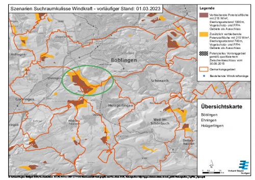Im grünen Kreis gelb und braun die Wind-Potenzialflächen, die die Kommunen Böblingen, Ehningen und Holzgerlingen an ihren gemeinsamen Gemarkungsgrenzen angemeldet hatten Zur Vollansicht bitte auf die Grafik klicken Quelle: Verband Region Stuttgart |