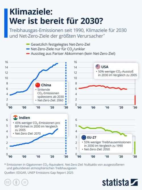 Die Grafik zeigt, wie sich Treibhausgasemissionen in den größten Verursacherländern und -regionen entwickelt haben und wie stark sie fallen müssen, damit die jeweiligen Länder ihre Klimaziele − sofern vorhanden − einhalten. Von den vier größten Verursachern, China, India, USA und der Europäischen Union, ist nur letztere auf dem Weg, bis 2030 eine signifikante Reduzierung zugunsten des Klimas zu verwirklichen.