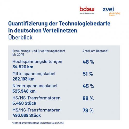 Untersucht wurde der Bedarf an Betriebsmitteln im Verteilnetz wie Hochspannungsleitungen, Mittel- und Niederspannungskabeln sowie Transformatoren für die verschiedenen Spannungsebenen bis 2045. Das Ergebnis: „Der Technologiebedarf ist auch in den Verteilnetzen groß“, heißt es in einer Mitteilung der beiden Verbände. Er entspreche 50 bis 80