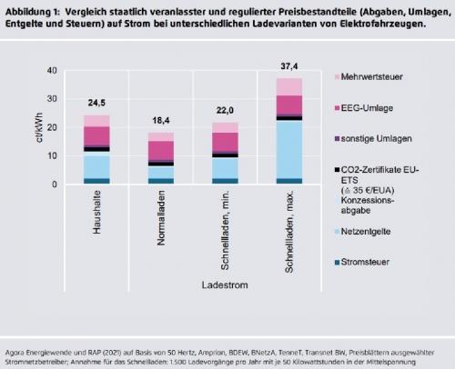 | Preisbestandteile von Strom für unterschiedliche Ladevarianten (zur Vollansicht bitte auf die Grafik klicken) Grafik: Agora Energiewende / RAP |