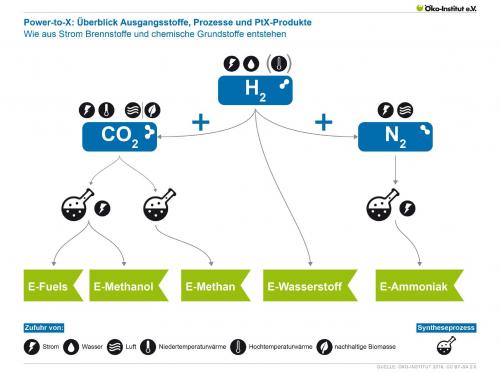 4) synthetisiert. Unter Zuhilfenahme von Strom entstehen in Syntheseprozessen E-Methanol (CHOH) oder andere E-Fuels.
