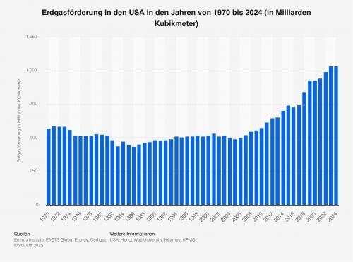 Die Statistik zeigt die Erdgasförderung in den USA in den Jahren von 1970 bis 2024. Die Werte sind in Milliarden Standardkubikmeter (gemessen bei 15 Grad Celsius und 1.013 mbar) angegeben. Da die Daten mit Hilfe eines Standardumrechnungsfaktors direkt von Tonnen Öläquivalent abgeleitet wurden, entspricht die angegebene Menge nicht immer den in den jeweiligen Länderstatistiken genannten Gasmengen. Nicht berücksichtigt wurden Fackelgas und Recyclinggas. Im Jahr 2024 betrug die Erdgasproduktion der USA rund 1.033 Milliarden Kubikmeter.
