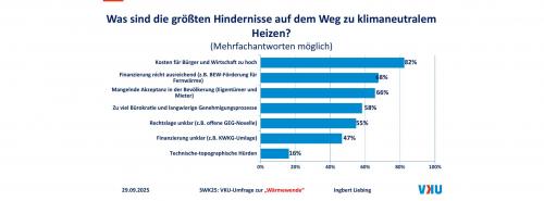 Der Verband kommunaler Unternehmen (VKU) hat beim Stadtwerkekongress in Mainz die Bundesregierung zu schnellen Entscheidungen für die Wärmewende aufgefordert. Laut einer Branchenumfrage unter 609 Stadtwerken und kommunalen Energieversorgern sehen die Unternehmen hohe Kosten, unzureichende Finanzierung und unklare Rechtslagen als zentrale Hürden.