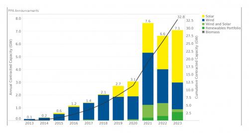 2022 hatte es erstmals eine Delle bei den neuen Corporate PPA gegeben: Die Leistung war gegenüber 2021 von 7.600