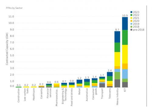 Die Grafik zeigt den Gesamtbestand der europäischen grünen Corporate PPA, aufgeteilt nach Abnehmerbranchen und nach den Abschlussjahren (Zum Vergrößern bitte auf die Grafik klicken) Quelle: Re-Source |