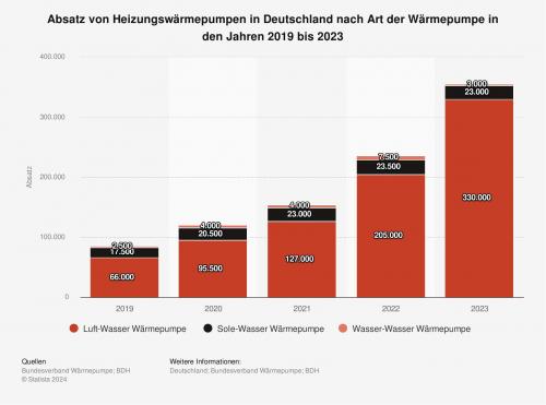 Es existieren drei Arten von Heizungswärmepumpen in Deutschland. Den höchsten Absatz erreichten in den letzten Jahren die Luft-Wasser Wärmepumpe. Im Jahr 2023 waren es rund 330.000