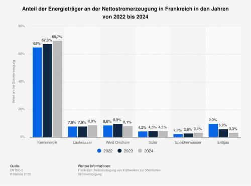 Im Jahr 2024 wurden in Frankreich rund 70 Prozent des erzeugten Stroms aus Kernenergie gewonnen. Etwa 12 Prozent des Stroms wurden hingegen aus dem erneuerbaren Energieträger Wasserkraft erzeugt. Frankreich war zuletzt Deutschlands größter Stromlieferant.