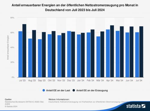 Der Beitrag der erneuerbaren Energien zur Stromversorgung in Deutschland ist mittlerweile bedeutend. Im Juli 2024 betrug ihr Anteil an der Stromerzeugung rund 69 Prozent. Der Anteil erneuerbarer Energie am Verbrauch lag derweil bei rund 61 Prozent.
