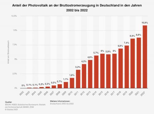 Prozent des erzeugten Stroms durch Photovoltaik produziert. Die Nutzung von Photovoltaikanlagen gewann mit den Jahren immer mehr an Bedeutung. So hat der Anteil des regenerativen Energieträgers Sonne seit dem Jahr 2003 kontinuierlich zugenommen. Die Grafik basiert auf Angaben von BDEW, Statistisches Bundesamt, BMWK, AGEB, Statistik der Kohlenwirtschaft und ZSW.
