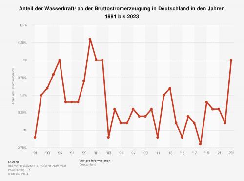 Im Jahr 2023 wurden rund vier Prozent des in Deutschland erzeugten Bruttostroms aus Wasserkraft gewonnen – das entspricht 18,7 Terawattstunden Strom. Wasserkraftwerke befinden sich hierzulande überwiegend in Süddeutschland. Bayern ist mit Abstand das Bundesland mit den meist gezählten Wasserkraftwerken.
