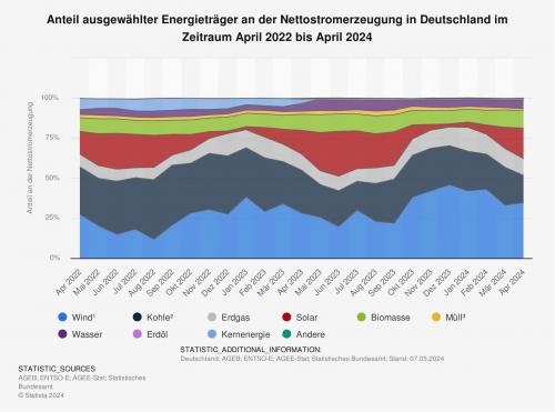 Die Statistik verdeutlicht, dass die erneuerbaren Energien zentraler Bestandteil der deutschen Stromerzeugung und -versorgung sind. Trotz Schwankungen hat speziell der Anteil der Nettostromerzeugung aus dem Energieträger Wind im dargestellten Zeitraum zugenommen und betrug im April 2024 rund 35 Prozent. Diese Daten basieren auf Angaben von