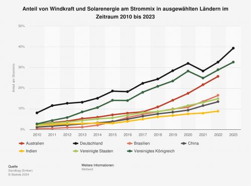 Prozent. Für die übrigen Länder lagen Stand Februar noch keine Daten für 2023 vor. Diese Statistik zeigt Länder, die zu den 20 größten CO₂-Emittenten gehören und ihren Anteil von Windkraft und Solarenergie am Strommix in den letzten Jahren stark ausgebaut haben.