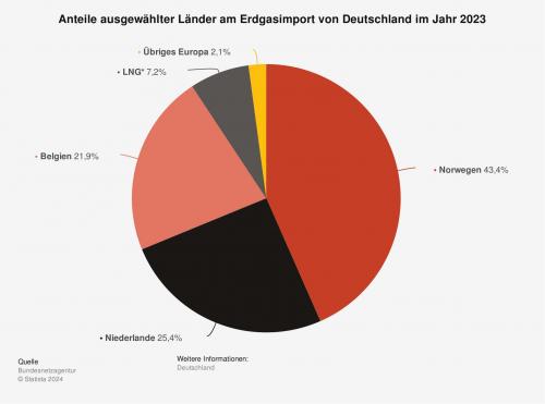 Deutschland bezieht nach Angaben der Bundesnetzagentur den Großteil der Erdgasimporte aktuell hauptsächlich aus drei Ländern. Dabei ist Norwegen im Jahr 2023 mit einem Anteil von 43