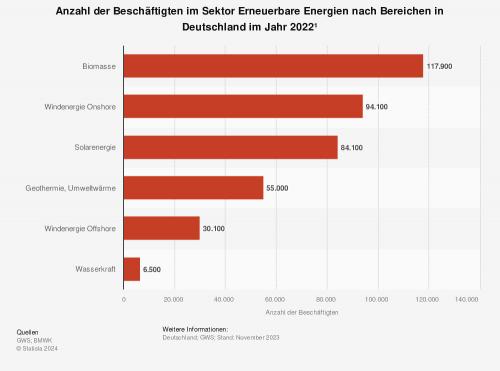 Die Statistik bildet die Zahl der Beschäftigten im Bereich der erneuerbaren Energien nach Branchen in Deutschland im Jahr 2022 nach Zahlen der