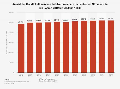 Die Statistik zeigt die Anzahl der Marktlokationen von Letztverbrauchern im deutschen Stromnetz nach Zahlen der Bundesnetzagentur und des Bundeskartellamtes in den Jahren 2012 bis 2022. Im Jahr 2022 existierten rund 52