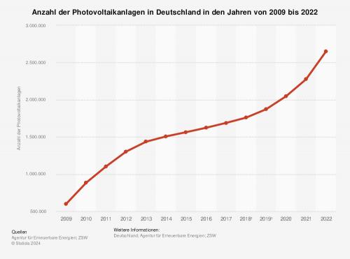 Seit 2009 steigt die Zahl der Photovoltaikanlagen in Deutschland stetig an, besonderes seit dem Jahr 2020. Zuletzt gab es nach Zahlen der Agentur für Erneuerbare Energien und des Zentrums