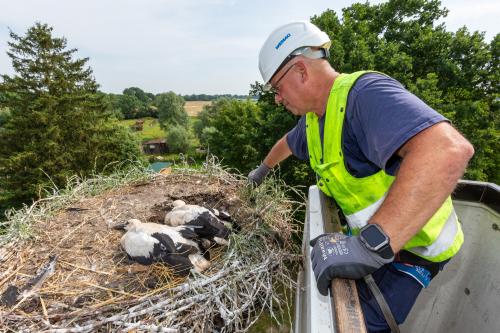 Derzeit sind ehrenamtliche Vogelschützer im Netzgebiet des Energieversorgers Wemag unterwegs. Mit Unterstützung des Netzbetreibers Wemag Netz beringen sie etwa drei Wochen alte Jungstörche, um deren Flugrouten und Überlebensraten verfolgen zu können. 250 Jungtiere im Amt Neuhaus und im Gebiet des alten Landkreis Ludwigslust beringen sie pro Brutsaison. Durch die Hubarbeitsbühne der Wemag gelangen die Tierfreunde an die Nester in acht bis elf Metern Höhe. Wemag-Vogelschutzbeauftrager Jan Koppelmann, erklärt: „Störche und Fischadler gehören zur Region.“ Der Energieversorger sehe sich in der Verantwortung, dass die Vögel sich nicht an den Netzanlagen verletzen und nicht die Stromversorgung stören. Daher rühre die jahrelange Zusammenarbeit mit örtlichen Naturschutzbehörden und ehrenamtlichen Vogelschützern. Im Bild zu sehen ist Wemag-Netz-Mitarbeiter Silvio Kirchner. Nach dem Beringen der Jungvögel kontrolliert er noch einmal das Nest.