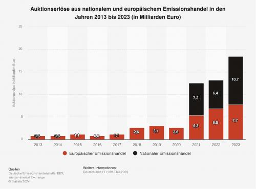 Insgesamt hat der Bund im Jahr 2023 nach Zahlen der Deutschen Emissionshandelsstelle, der EEX und Intercontinental Exchange 18,4 Milliarden Euro mit der Versteigerung von Emissionsrechten eingenommen − damit stiegen die Einnahmen auf einen neuen Höchstwert. Dies umfasst Auktionserlöse sowohl aus dem Europäischen Emissionshandels-System (EU ETS) als auch aus dem nationalen Emissionshandel. Der EU ETS deckt vor allem Kraftwerke, Industrie und innereuropäische Flüge ab, während innerhalb Deutschlands Zertifikate für Emissionen in den Sektoren Wärme und Verkehr gehandelt werden.