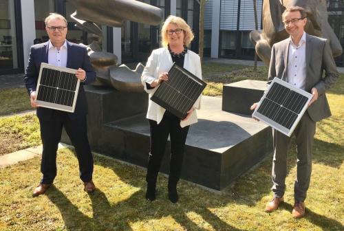 | Gruppenbild mit PV-Modulen (v.l.): Andreas Stauber und Tanja Stauber (beide SG Solartechnik) mit Thomas Oppelt (Bayernwerk Sonnenenergie) Quelle: Bayernwerk / Maximilian Zängl |
