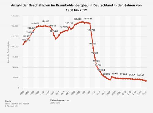 Die Anzahl der Beschäftigten im Braunkohlenbergbau in Deutschland ist laut der Statistik der Kohlenwirtschaft e.V. nach der deutschen Wende 1989 stark gesunken. Im Jahr 2022 waren etwa 17.000 Personen im Braunkohlenbergbau in Deutschland beschäftigt. Zu Hochzeiten waren es knapp 160.000 (von 1983 bis 1985).