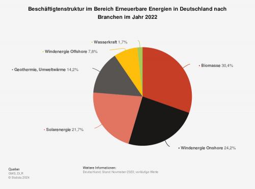 Prozent arbeiteten im Jahr 2022 in der Onshore-Windenergiebranche. Die Verteilung basiert auf einer absoluten Zahl von 387.700 Beschäftigten im Sektor der Regenerativen.
