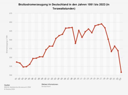 Im Jahr 2023 wurden nach Zahlen des BDEW, des Statistisches Bundesamts und des ZSW in Deutschland rund 508