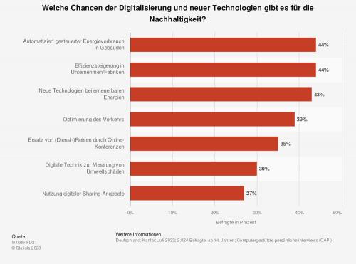 Prozent teilen sich die Automatisierung des Energieverbrauch in Gebäuden und die Effizienzsteigerung in Unternehmen/Fabriken den ersten Platz bei den Chancen der Digitalisierung für die Nachhaltigkeit, so eine Erhebung der Intiative D21. Ebenso sehen 43