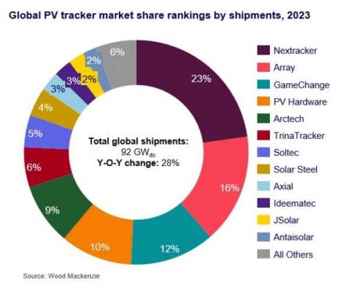 dc, direct current) gewachsen. Das hat das Beratungs- und Analyseunternehmen Wood Mackenzie ermittelt. Im neunten Jahr in Folge waren demnach Nextracker and Array Technologies die Hersteller Nummer eins und zwei. Erstmals eroberte Game Change Solar den dritten Rang. Die USA waren mit 37.000