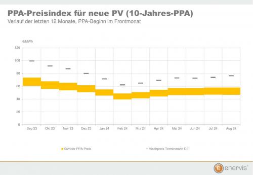 Die Preiskorridore für marktübliche Power Purchase Agreements haben sich im August 2024 leicht erhöht. Das ergibt der PPA-Preisindex von E&M und Enervis.