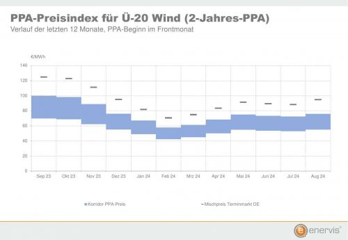Der Terminmarkt-Mischpreis, der die Referenz für diesen PPA-Preis darstellt, ist im August auf rund 95 Euro/MWh angestiegen. Im Juli hatte er bei 88 Euro/MWh gelegen.