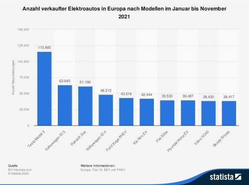Von Januar bis November 2021 war der ID.3 von Volkswagen Nummer 2 bei den beliebtesten Elektroautos in Europa. Topmodell ist Teslas Model 3, vorne mit dabei Renaults Zoe. Diese beiden Modelle führten das