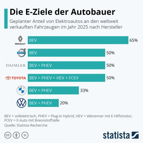 Wie die Statista-Grafik zeigt, sind Daimlers Ziele ambitioniert. Derzeit werden sie nur von Volvo und Renault überboten. Bis 2025 werde die Renault Group zehn neue vollelektrische Modelle auf den Markt bringen. Damit will das Unternehmen die nachhaltigste Modellpalette in Europa anbieten, mit einem E-Anteil von mindestens 65
