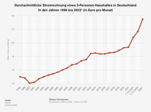 Bei einem Stromverbrauch von 3.500 kWh zahlte ein 3-Personen-Musterhaushalt in Deutschland durchschnittlich 134,94 Euro pro Monat für Strom (Stand: Juli 2023). Der Strompreis setzte sich zum größten Teil aus den Faktoren Netzentgelt, Beschaffung und Vertrieb sowie EEG-Umlage zusammen. Die Strompreisanalyse führte der Bundesverband der Energie- und Wasserwirtschaft (BDEW) durch.