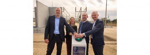 | Bei der Inbetriebnahme der Einspeisesteckdose: v.l. Christian Barr (LEW Vorstand), Barbara Plura (Technische Netzplanerin bei LEW Verteilnetz), Hubert Aiwanger (Wirtschaftsminister Bayern, Freie Wähler), Dietrich Gemmel (LEW Vorstand). Quelle: LVN / Jonas Ziegler |