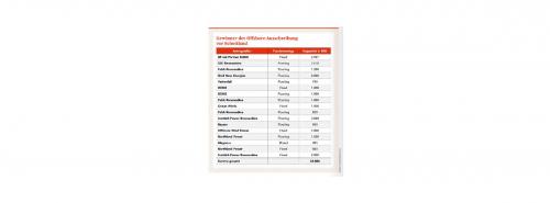 Ambitionierte britische AusbauzieleDas Auktionsergebnis in Schottland ist bereits der zweite Erfolg für die Partnerschaft von EnBW und BP. Vor einem Jahr erhielten die beiden Unternehmen den Zuschlag für eine Fläche zum Bau von 3.000 MW in der Irischen See. Die Projekte „Morgan“ und „Mona“ liegen vor der Küste zwischen Liverpool und der Isle of Man. Das Investitionsvolumen dürfte deutlich über 4 Mrd. Euro liegen.