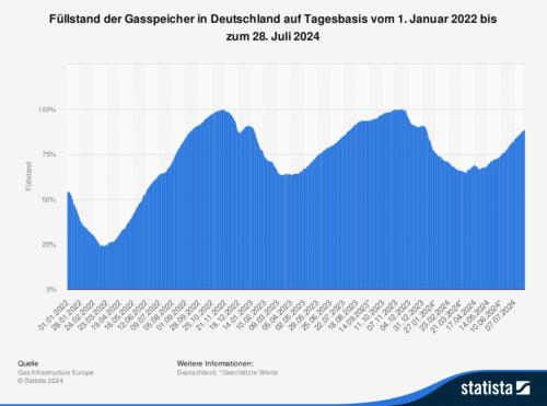 Innerhalb der Europäischen Union verfügt Deutschland über die größten Erdgas-Speicherkapazitäten, insgesamt sind es rund 261 Milliarden kWh. Das Prinzip: Im Sommer wird eingespeichert, im Winter werden die Vorräte in erster Linie fürs Heizen genutzt. Ähnlich ist es in anderen europäischen Ländern. Derzeit sind die Lagerstätten zu mehr als 80