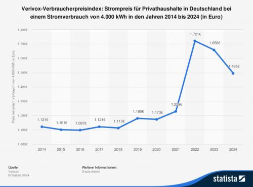 Die Statistik zeigt die Strompreisentwicklung in Deutschland nach Zahlen von Verivox in den Jahren 2014 bis 2024. Laut dem Online-Verbraucherportal Verivox betrugen 2024 die jährlichen Stromkosten für deutsche Privatverbraucher bei einem Stromverbrauch von 4.000 kWh rund 1.495 Euro.