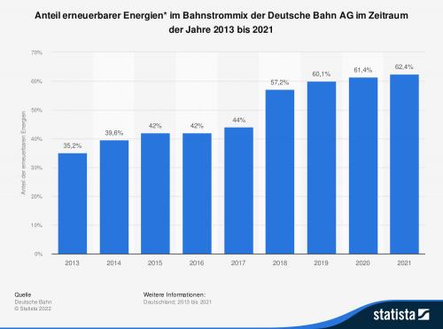 Die Statistik zeigt den Anteil erneuerbarer Energien im Strommix der Deutschen Bahn in den Jahren 2013 bis 2021. Der Anteil von Strom aus Wasser-, Wind- und Sonnenenergie kam in den vergangenen Jahren nur wenig voran.