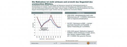 Euro/MWh unter dem Referenzszenario liegen. Von 2031 an drohten jedoch stärkere Preissteigerungen, weil dann weniger gesicherte Kraftwerkskapazitäten und Flexibilitäten zur Verfügung stünden. Im Durchschnitt könnten die Strom-Großhandelspreise über einen längeren Zeitraum sogar höher ausfallen als ohne die Maßnahme. Damit erreiche der Einsatz der Netzreserve das Gegenteil des beabsichtigten Effekts.