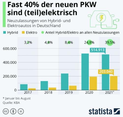 Fast 40 % der 2021 bis August neu in Deutschland registrierten PKW fahren laut Kraftfahrt-Bundesamt (KBA) ganz oder teilweise elektrisch. In absoluten Zahlen ausgedrückt, wurden von Januar bis August 514.913 Wagen mit Hybrid-Antrieb und 203.040 reine Elektroautos neu zugelassen.
