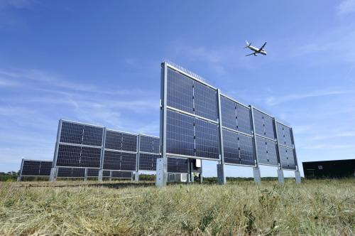 Der Frankfurter Flughafenbetreiber Fraport setzt den Bau der Photovoltaik-Anlage entlang der Startbahn West fort. Bei Fertigstellung sollen sich die senkrecht installierten Solarzäune über eine Länge von 2.800 Metern an der Startbahn entlangziehen. Im