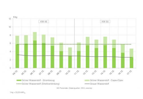 | Wasserstoffpreisindex in den Kalenderwochen 49 und 50. Zur Vollansicht bitte auf die Grafik klicken Quelle: enervis energy advisors GmbH / EEX |