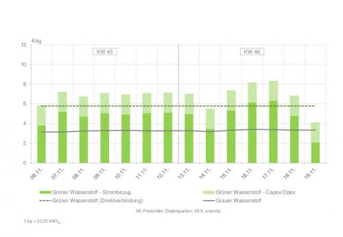 | Wasserstoffpreisindex in den Kalenderwochen 45 und 46. Zur Vollansicht bitte auf die Grafik klicken Quelle: enervis energy advisors GmbH / EEX |