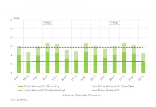 | Wasserstoffpreisindex in den Kalenderwochen 29 und 30 (zur Vollansicht bitte auf die Grafik klicken) Quelle: enervis energy advisors GmbH / EEX |